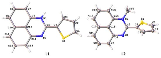The asymmetric unit of the L1 crystal consists of the main molecule and one solvent dichloromethane while that of the L2 contains only the perimidine. In both structures, the main molecules comprise the flat perimidine system and the 2-thienyl ring which are twisted in a greater or lesser extent depending on the N-substituent and likely the packing effects (Figure 2, Tables S1 and S3). L1 is almost flat while L2 shows notably larger interplanar angle between the aromatic parts because of steric repulsion between the N-methyl group and the 2-thienyl ring. The hydrogen atom at the C13 atom imposes an additional strain in the molecule and makes the perimidine system and the N–CH3 non-coplanar bond (see Table S3 for details).