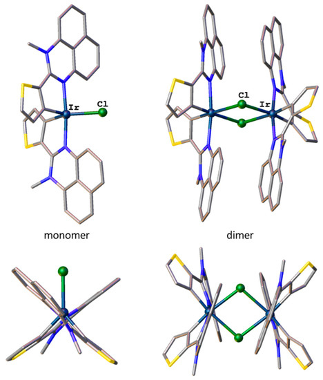 In the case of the dimer based on perimidine L2, DFT calculations reveal distortions of the iridium octahedrons in combination with significant deformations of the cyclometalated ligands (Figure 5). The Ir–C distances (1.98 Å) lie within the expected range, whereas the Ir–N (2.13 Å) and Ir–Cl (2.64 Å) bonds are slightly longer than those in reported μ-chloro-bridged dimers (1.93–2.05, 1.99–2.11 and 2.43–2.61 Å, respectively) according to the Cambridge Structural Database (CSD, ver. 5.4, 3 November 2021). While the arrangement of the ligands is strictly controlled by the iridium(III) ion coordination preference the conformation of the ligands is additionally regulated by π···π stacking between the perimidine moieties. So, in the resulting conformation, the dihedral angle between the metalated thienyl ring and the perimidine system reaches 30°. In contrast, the optimized geometry of the pentacoordinated monomer with chloride lying in the equatorial plane contains almost planar aromatic ligands with deviations from planarity not exceeding 10°. Nevertheless, the dimer appears more stable than the monomer with the energy gain of 10 kcal·mol−1, indicating that the strong preference of the iridium(III) ion for octahedral geometry has a dominant effect on the structure of the cyclometalated chloride.