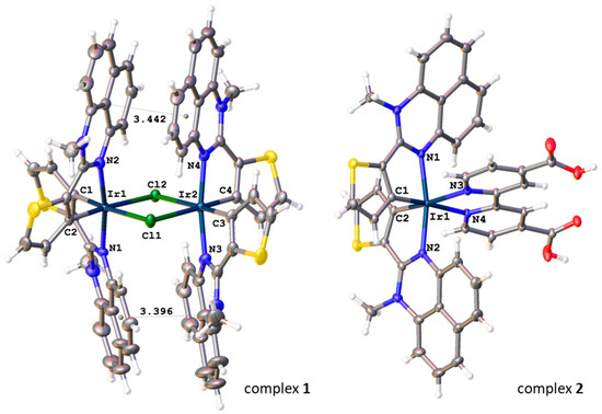 Though the vast majority of C^N-cyclometalated iridium(III) chlorides are μ-chloro-bridged dimers [27], it is well documented that the increase in the steric pressure (for example, induced by phenanthroimidazole-based cyclometalated ligands) destabilizes the iridium octahedron and rare monomeric trigonal–bipyramidal chlorides can be isolated [28,29,30,31,32,33]. Given that the perimidine core is sterically more bulky than nitrogen-containing parts of cyclometalated ligands commonly used in iridium(III) chemistry (in most cases, pyridine ring in 2-phenylpyridines), and is rather similar to the phenanthroimidazole unit, the formation of the above monomeric species becomes possible.