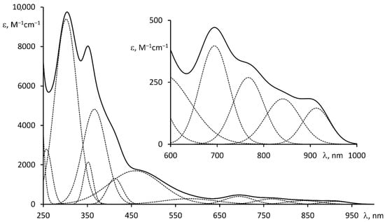 Heteroleptic complex 2 isolated as a completely black powder turns dark red in solution (acetonitrile) and exhibits a UV-vis spectrum which at least in the visible range is drastically different from anticipated for bis-cyclometalated iridium(III) complexes [27] (Figure 7). In addition to the common intraligand π → π* electronic transitions in the UV range and less intensive MLCT bands at 450–550 nm the complex surprisingly possesses several bands at 650–950 nm. Deconvolution of the spectrum into its Gaussian components reveals six individual bands in the visible range with ε varying from 200 to 2000 M−1cm−1 (Table 1). Though each band is of moderate intensity the cumulative absorption efficiency is high enough to consider this complex as a promising photosensitizer for dye-sensitized solar cells.