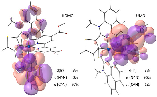 Frontier molecular orbitals of both the dimer and monomer are mainly localized at the ligands. The perimidine system hosts 70–80% of the HOMO and 40–50% of the LUMO (at the nitrogen heterocycles), while π-orbitals of the thienyl rings contribute mainly to the LUMO (~50%) and make lesser contributions to the HOMO (~10%). So, cyclometalation of the L2 by the iridium ion, regardless of the product formed, does not result in noticeable redistribution of the electron density at either the ground or excited states of the cyclometalated ligand compared with its uncomplexed form.