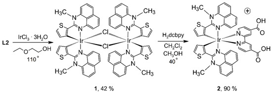 Preparation of cyclometalated iridium(III) complexes with 1-methyl-2-(2-thienyl)perimidine and «anchoring» 4,4′-dicarboxy-2,2′-bipyridine (H2dcbpy). Purification of 2 was carried out by column chromatography with eluent containing triflic acid, so the counterion in the isolated complex 2 was CF3SO3−.