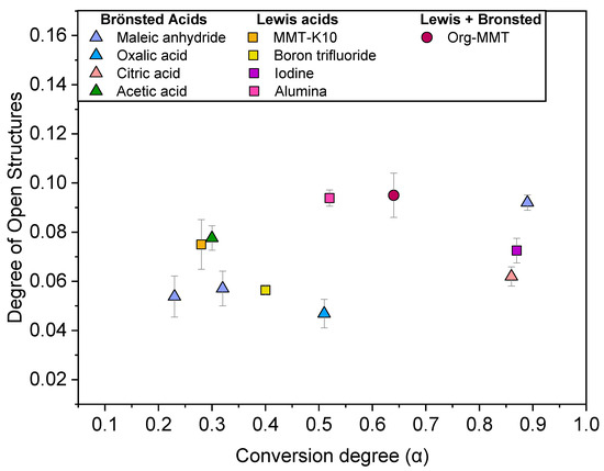 First, the role of the acidic initiator on the furan ring opening was studied by comparing Brönsted initiators, such as citric acid, oxalic acid, and acetic acid, with Lewis initiators, such as boron trifluoride, iodine, alumina, or montmorillonite K10 (MMT-K10). Most have already been used in the past [33,34,35]. A Brönsted superacid, such as trifluoromethanesulfonic acid, as well as initiators combining the two acidities such as cation exchanged montmorillonite with alkyl-ammonium, were also employed. Indeed, cation exchanged montmorillonite (Org-MMT) displays a dual acidity which, as highlighted by Zavaglia et al. [34], leads to an acceleration of the FA polymerization rate. Therefore, the dual acidity of Org-MMT might arguably affect the ring opening occurring during polymerization. The effect of additional water on the ring opening was investigated as well.