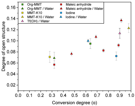 Comparison of the degree of open structures obtained by titration method and synthesized with different initiators with and without additional water (50/50 w/w) as function of the conversion degree.
