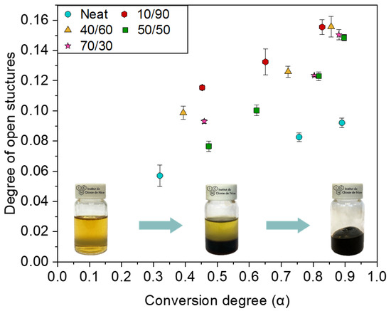 Figure 3 and Figure S3 highlight that the DOS is continuously increasing with the conversion degree, independently of the FA/water ratio. The neat PFA shows the lowest DOS overall from the beginning to the near end of the polymerization, i.e., α ≈ 0.9. Regarding the water ratios, systems with less water (40/60 and 10/90) have slightly higher DOS than the 50/50 and 70/30 ratios at α < 0.80. Nonetheless, at higher conversion degrees, i.e., α ≈ 0.9, the gap shrinks around a DOS of 0.15. This is most likely due to the insolubility of PFA in water. Indeed, FA and water are miscible, whereas above α ≈ 0.20 a demixion occurs, as depicted in Figure 3. Thus, small, open, and water-soluble oligomers might not be taken into account in the DOS at low conversion degrees.
