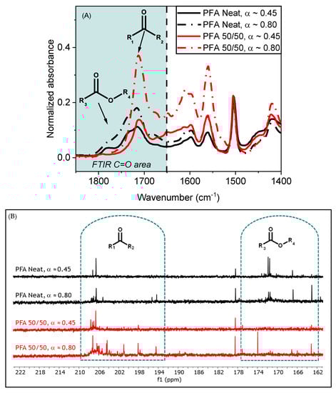 Finally, the 13C NMR spectra of PFA 50/50 in Figure 4B exhibits a significant number of carbonyl peaks from 194 to 210 ppm. Most of them are centered around 208 ppm, which matches with 1,4-diketones. Similar peaks can be found in the neat PFA. However, at α ≈ 0.80, new peaks rise in the 194–205 ppm area, in PFA 50/50 only. This confirms the existence of types of carbonyl containing species other than 1,4-diketones in this system.