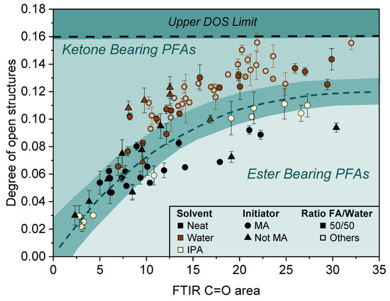 Figure 5 shows the DOSTitri as function of the FTIR C=O area for all the investigated PFAs. A separation between PFAs prepared with additional water, the ones prepared in neat conditions, and the ones prepared with additional IPA is portrayed in Figure 5. It is worth mentioning that both ketones and aldehydes functions are quantified by the oximation method, but this is not the case for the ester function. However, it is rather difficult to discriminate the ketones/aldehydes from the ester functions when integrating the more or less broad carbonyl peak in FTIR. Accordingly, if only ketones or aldehydes are present in the systems, the C=O content should increase linearly with the FTIR C=O area. However, if other functional groups such as esters are taken into account in the C=O area, the DOS vs. the C=O area will not be linear.