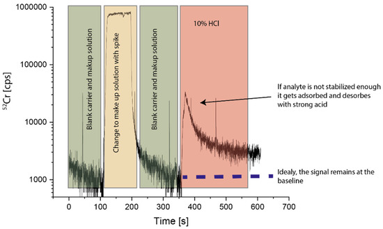 Figure 1. A series of standard solutions of the elements of interest were prepared in different candidate make-up solutions. The candidate make-up solution and a candidate carrier solution were flown through the cell until a stable background signal was reached. Then, a defined amount of a spiking material was added to the make-up solution, causing a sudden increase in the respective ICP-MS signals. After the signals in the ICP-MS reached a plateau for all elements, the spike solution was exchanged to the pure make-up solution again. After the signal stabilized again, a washing step with 10% HCl was performed (flown through both inlets). If the analyte was adsorbed onto the walls of the system, in this washing step, a strong peak in the signal would appear; if not, the analyte signal would remain at the baseline level. The lowest acid concentration in the make-up and carrier solutions able to achieve this behavior was considered optimal. Based on the experience reported in [