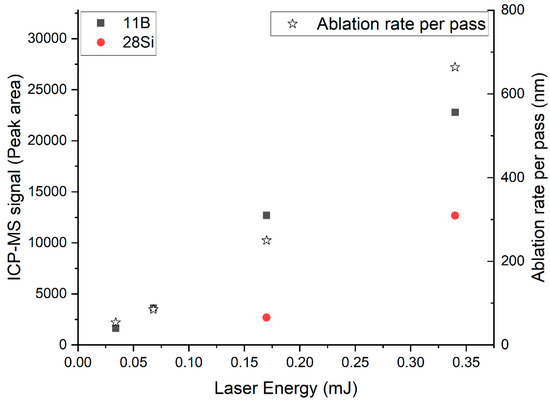 This outcome indicates that the sensitivity of the silicon analysis was the limiting factor, as the amount of ablated material decreased concomitantly with the reduction in the thickness of an ablation layer. Nevertheless, for elements with an enhanced sensitivity in ICP-MS analysis, investigations with a better depth resolution were possible. In the case of B, even for the lowest laser energy, excellent signals were obtained (for details see