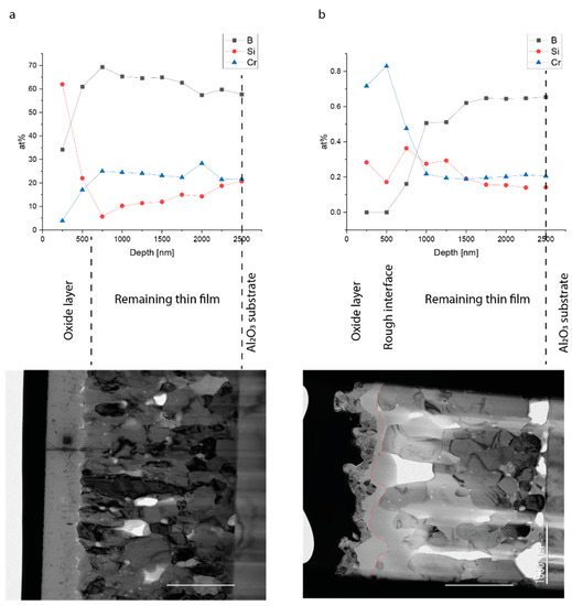The performed online-LASIL measurement revealed a very similar outcome, showing for the first ~500 nm a distinctly different composition when compared to the rest of the sample. The first ablation layer exhibited a stoichiometry of Cr0.04Si0.62B0.34, indicating an enrichment of silicon in the oxide thin film. With the fourth ablation layer, the sample nearly reached its native bulk composition.