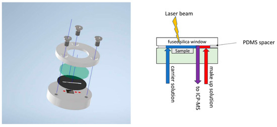 Figure 5) consisted of a PEEK (polyether ether ketone) body with a 5 × 5 × 0.5 mm pocket to contain the sample. The employed LASIL cell design contained two inlets and one outlet for fluids. The cell was sealed by a PDMS (polydimethylsiloxane) film (500 µm thick) containing the 500 µm wide flow path to guide the liquid over the sample. A fused silica window, transparent to the UV laser wavelength, was placed on top and aligned to the body by a counterpart made of PEEK. A peristaltic pump (Perimax 12, SPETEC, Erding, Germany) was used to transport the required fluid flows through the system. All tubing was made out of PFA with an inner diameter of 0.5 mm on the input side and 0.25 mm between the LASIL cell and the ICP-MS instrument.