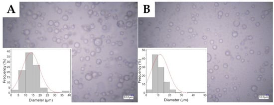 To determine the presence and size distribution of the dispersed phase, a VHX-6000 digital microscope (Keyence, Japan, Osaka) was used. The emulsions were placed between the microscope slides and immediately observed in the bright field mode. The diameter of 100 micelles for each sample was measured using ImageJ software (Fiji ver. 1.53f, October 2020). On this basis, the micelles size distribution was obtained.