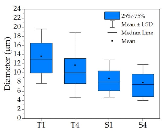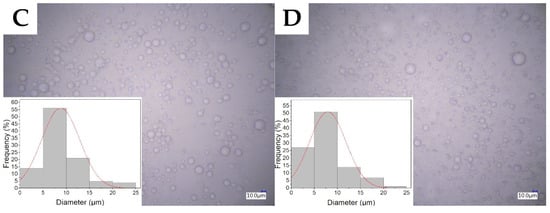 Images of micelles from an optical microscope are presented in Figure 1. Spherical micelles were obtained for all samples, which differed in size depending on the type of surfactant used. Micelles in T1 and T4 emulsions were characterized by a wider range of size distribution with the presence of micelles with a significantly larger diameter deviating from the mean value (Figure 1a,b). In the case of S1 and S4 emulsions, a more symmetrical diameter size distribution was indicated on more uniform micelles obtained by SDS (Figure 1c,d). The micelle size distributions expressed as the interquartile range, mean and standard deviation (SD) are presented in Figure 2. Among the emulsions obtained, two groups of significantly different micelles sizes can be distinguished (ANOVA, α = 0.01, N = 100). The first one consisted of emulsions containing non-ionic surfactants that showed a larger micelle diameter with an interquartile range of ~6 µm and a mean of ~12–14 µm. The second group was emulsions containing anionic surfactant. The addition of SDS contributed to the formation of micelles with an interquartile range of ~5 µm and a mean diameter of ~8–9 µm (Table 1). Moreover, the micelle diameters did not differ significantly in the samples containing the same surfactant but different concentrations (ANOVA, α = 0.01, N = 100).