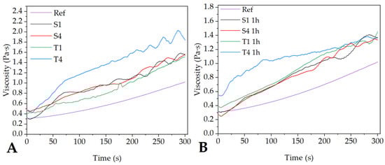 However, the results obtained one hour after the preparation of the emulsion (Figure 3B) showed a strong decrease in the viscosity of the T4 emulsion, while the remaining samples maintained their stability. This indicates a tendency of Tween 80 to form small micelles in the first moments after the formation of the emulsion, which, however, quickly destabilize (due to, for example, coalescence or flocculation) [37]. Nevertheless, all samples exhibit a higher viscosity than the reference sample regardless of the measuring time.