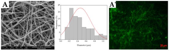 Images obtained from a fluorescent microscope are presented in Figure 4A’–D’. The green areas visible in the pictures indicate the presence of a fluorescent dye (fluorescein). Since it was introduced only into the aqueous phase, it also indicates the localization of the core part of the fibers. In general, the lack of empty spaces indicates the non-domain nature of fluorescein localization and the uniform distribution of BSA within the emulsion electrospun fibers. However, there are several fluorescein aggregation spots that could indicate sites with an incompletely developed core.