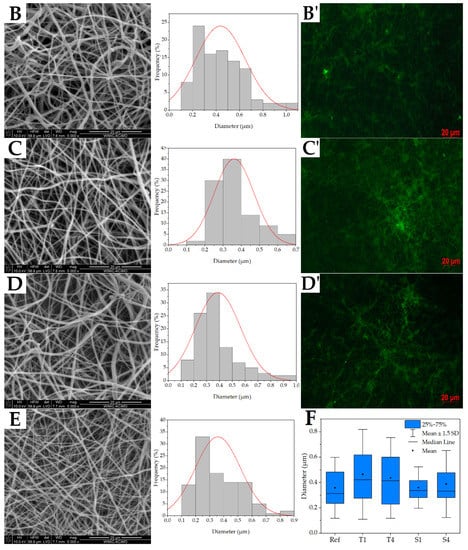 SEM micrographs, fibers size distribution (A–E), and fluorescence microscope images (A’–D’) of T1 (A,A’), T4 (B,B’), S1 (C,C’), S4 (D,D’), and PCL (E) fibrous scaffolds. Box chart of the fibers’ size distribution (F).