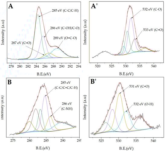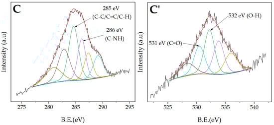 C1s (A–C) and O1s (A’–C’) deconvoluted spectra of neat PCL fibers (A,A’), T1 (B,B’), and S1 (C,C’).