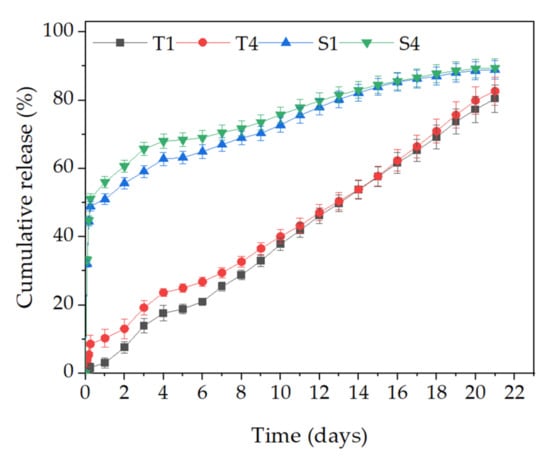 The BSA cumulative release curves from the emulsion electrospun fibers are presented in Figure 7. The results show that character of BSA release was strongly dependent on the choice of surfactant. The shape of the release curve was similar within one type of surfactant regardless of its concentration, but differed for the two different types of surfactant. In the case of the anionic surfactant (S1 and S4), burst release occurred in the initial stage of incubation (first six hours). The ejection phase (up to ~50% of the initial amount of BSA in the fibers) was followed by the constant release of the peptide over a period of 14 days until reaching ~90% of the initial mass. On the other hand, the T1 and T4 samples exhibited the constant release of a small amount of BSA from the beginning up to the 21st day of incubation.
