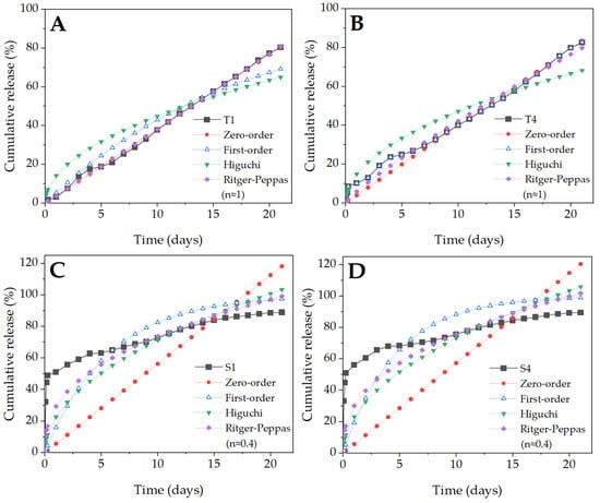 In vitro release profiles of the emulsion electrospun samples: T1 (A), T4 (B), S1 (C), and S4 (D) with fitted curves based on four kinetic equations. The experimental data were compared with four models: zero-order, first-order, Higuchi, and Ritger-Peppas. The best fit was obtained by optimizing the K value in order to minimize the mean square error.