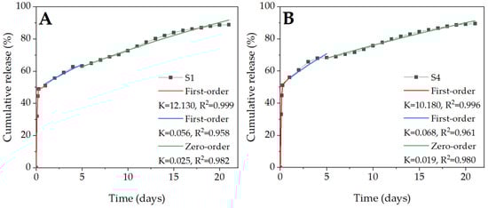 The three-phase model of BSA release for the S1 (A) and S4 (B) samples. The experimental data were divided into intervals (corresponding to different phases), which were compared with the zero-order, first-order, and Higuchi models. The best fit was obtained by optimizing the K value in order to minimize the mean square error.