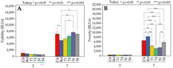 As with the viability test, the cytotoxicity on the 3rd day of incubation did not differ in all samples (Figure 10B). On the 7th day of culture, the reference sample showed the most detrimental action towards the cells. Samples T1, T4, and S1 showed the lowest cytotoxicity among the samples of electrospun emulsion at the same level of significance. The toxicity of the S4 sample was slightly higher, but it was also comparable to the control. Overall, all BSA-containing nonwovens exhibited the lowest cytotoxicity.