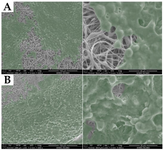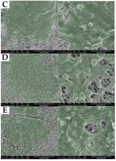 Interactions of cells with nonwovens after 7 days of incubation are presented on SEM micrographs (Figure 11). Macrophages spread over the surface of each emulsion electrospun sample, regardless of the surfactant used. They had no special surface preferences but were evenly spread across the surface and formed large aggregates almost covering the surface of the fibrous mat. However, cells only flattened on the surface of the samples but did not infiltrate the material. The same effect was shown by neat PCL fibers (Figure 11E). The reason was the low porosity resulting from the small diameter of the fibers.