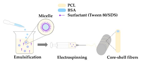 In our research, core-shell fibers based on PCL enriched with BSA were produced using emulsion electrospinning. In order to limit the adverse effect of organic solvents on the encapsulated protein, two types of surfactants differing in the polarity of the hydrophilic head, molecular mass, and CMC were used: non-ionic, macromolecular (Tween 80) and anionic, micromolecular (SDS). Tween 80 is a hydrophilic surfactant with HLB = 15 and is considered an emulsifier, while SDS (empirical HLB = 40) is also a hydrophilic surfactant, however, its affinity to the water phase is characteristic of solubilizers. Tween 80 has a molecular mass of 1 310 g/mol (the highest among the “Tween family”) and a CMC value ~0.015 mM at room temperature (~25 °C) [24], while SDS has a molecular mass of 288 g/mol, which is significantly lower and a CMC ~0.008 M [24,40]. This paper focuses on the influence of both the type and concentration of surfactant on the physicochemical and rheological properties of emulsion and its correlation with the physicochemical and biological properties of nonwovens. The aim of the research was to obtain a substrate characterized by high encapsulation efficiency, extended-release time, and increased cell viability.