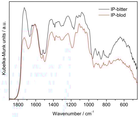 The strong bands in the 1550–1800 cm−1 region, with maxima at 1610, 1643 (IP-bitter) and 1730 cm-1, are assigned to the stretching modes of carboxylate groups (νasCOO−), carbonyl groups from non-esterified hydrogenated acidic carbonyl groups (νC=Oacid) and esterified galacturonic acid (νC=Oester), respectively [14]. In this region, the relative intensities of the ester-related components are much higher for IP-bitter pectin, suggesting a higher degree of esterification.