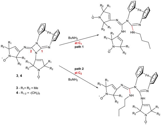 - Bagryanskaya, I.; Fedin, M.; Gorbunov, D.; Gritsan, N.; Gurskaya, L.; Kazantsev, M.; Polienko, Y.; Stass, D.; Tretyakov, E. A Nitroxide Diradical Containing a Ferrocen-1,1′-Diyl-Substituted 1,3-Diazetidine-2,4-Diimine Coupler. Tetrahedron Lett. 2017, 58, 478–481. [Google Scholar] [CrossRef]
