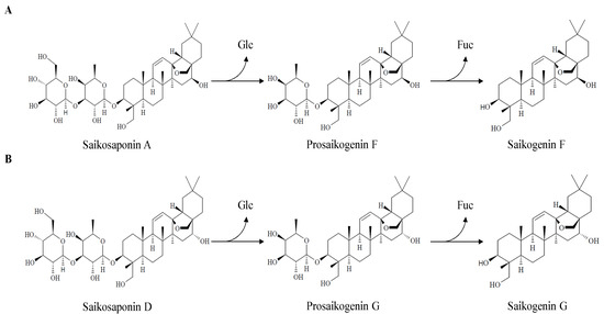 Biotransformation pathway of saikosaponins. (A) Biotransformation pathway of saikosaponin A into saikogenin F via prosaikogenin F by BglPm; (B) Biotransformation pathway of saikosaponin D into saikogenin G via prosaikogenin G by BglLk.