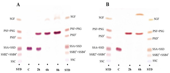 Time-course thin layer chromatography (TLC) analyses of saikosaponin A and D biotransformation by BglPm and BglLk, respectively; (A) TLC analysis of biotransformation saikosaponin A by BglPm.; Lane STD, saikosaponin standard; Lane C, substrate saikosaponin A; Lane 2 h, the reaction after two-hours treatment with BglPm; Lane 6 h, the reaction after six-hours treatment with BglPm; Lane 8 h, the reaction after eight-hours treatment with BglPm. (B) TLC analysis of biotransformation saikosaponin D by BglLk.; Lane STD, saikosaponin standard; Lane C, substrate saikosaponin D; Lane 2 h, the reaction after two-hours treatment with BglLk; Lane 6 h the reaction after six-hours treatment with BglLk. * “SSB2” means saikosaponin B2; “SSB4” means saikosaponin B4; “PSD” means prosaikogenin D.
