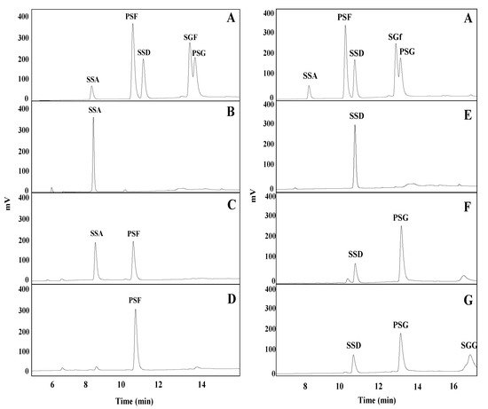 HPLC results of the biotransformation saikosaponin A and saikosaponin D by BglPm and BglLk, respectively (A) saikosaponin standard; (B) substrate saikosaponin A; (C) the reaction after two-hours treatment with BglPm; (D) the reaction after eight-hours treatment with BglPm; (E) substrate saikosaponin D; (F) the reaction after two-hours treatment with BglLk; (G) the reaction after six-hours treatment with BglLk.
