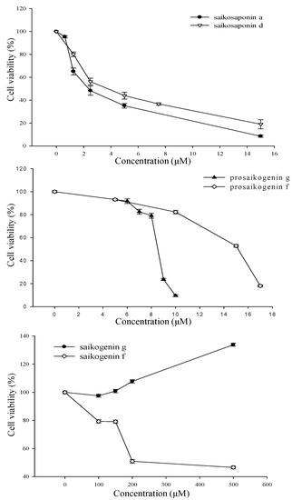 Treatment with saikosaponin A, saikosaponin D, prosaikogenin F, and prosaikogenin G caused significant cell death in HCT 116 cancer cells at the tested concentrations. However, saikogenin F and G did not show significant anti-cancer effects. The IC50 values of saikosaponin A, saikosaponin D, prosaikogenin F, and prosaikogenin G on HCT 116 cancer cells were 2.83, 4.26, 14.21, and 8.49 μM, respectively (Figure 5), which suggests that they exert an anti-cancer effect on HCT 116 cancer cell lines. In contrast, saikogenin G did not inhibit HCT 116 cancer cell line growth at the various concentration ranges within 24 h (Figure 5). Rather, it caused the growth of cancer cells. Saikogenin F only caused the death of cancer cells at a very high concentration (Figure 5); thus, it was considered to not exhibit significant anti-cancer effects.