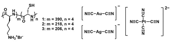 Molecular structures of the diblock copolypeptide amphiphiles Lys390-b-Cys4 (1), Lys218-b-Cys4 (2), and Lys206-b-Cys4 (3), and of the cyanometallate complexes [Au(CN)2]−, [Ag(CN)2]−, and [Pt(CN)4]2−.