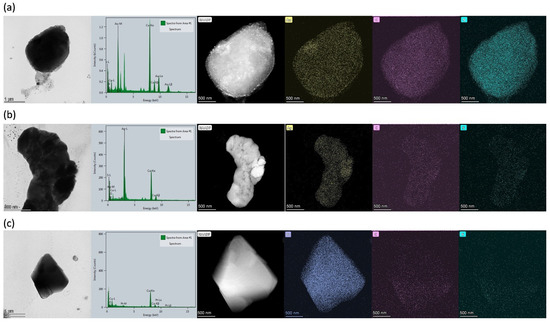 The detailed morphologies and diverse structures of the polypeptide/cyanometallate complex hybrids were also observed using high-angle annular dark-field scanning TEM (HAADF-STEM) (Figure 5). High-resolution STEM coupled with energy-dispersive X-ray spectroscopy (HR-STEM EDX) also confirmed that the hybrids consisted of both cyanometallate complexes and polypeptides. Figure 5 presents STEM-EDX maps of hybrids containing 1 with [Au(CN)2]− (Figure 5a), [Pt(CN)4]2− (Figure 5b), and [Ag(CN)2]− (Figure 5c).