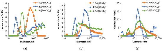 Dynamic light scattering results for hybrids of (a) [Au(CN)2]−, (b) [Ag(CN)2]−, and (c) [Pt(CN)4]2− with diblock copolypeptide amphiphiles 1–3, where [Au(CN)2]− = 3.5 mM, [Ag(CN)2]− = 5.0 mM, and [Pt(CN)4]2− = 2.7 mM.