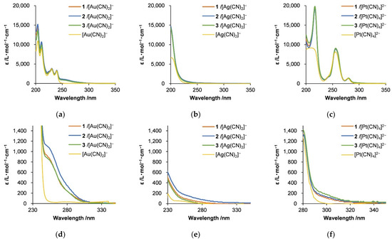 UV-visible spectra of hybrids of (a) [Au(CN)2]−, (b) [Ag(CN)2]−, and (c) [Pt(CN)4]2− with diblock copolypeptide amphiphiles 1–3, where [Au(CN)2]− = 3.5 mM, [Ag(CN)2]− = 5.0 mM, and [Pt(CN)4]2− = 2.7 mM. (d–f) Spectra enlarged to show region from 230 to 350 nm to focus on metal-metal interactions.