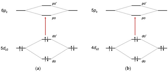 The metallophilic interactions and self-assembly of the cyanometallate complexes with the polypeptides were also investigated by UV-visible absorption spectroscopy (Figure 7). The mixing of aqueous solutions of the various cyanometallate complexes with the polypeptides resulted in the appearance of shoulder peaks at approximately 250–320 nm. In the case of the Au complex hybrids, a shoulder appeared at 250–280 nm that was not produced by the pure complex in solution. This absorption (5dσ*→6pσ, Figure 8a) originated from Au-Au interactions [61,62]. The Ag complex hybrid also generated a shoulder at 230–250 nm that was also not seen in the spectrum of the pure complex and was also ascribed to an Ag-Ag interaction (4dσ*→5pσ, Figure 8b) [60], as in the case of the Au hybrid. The absorption peaks for the [Pt(CN)4]2− hybrids at 200–270 nm were attributed to charge-transfer absorption for the Pt complex (5d→6p) or to interaction with the π-orbitals of the cyanide ligands [60]. Thus, these results confirm that metallophilic interactions took place, although these interactions did not greatly change the spectra because the associated electronic transitions are forbidden. In addition, it is noteworthy that the structural changes in the hybrids were dependent on the metal complex that was used, especially in the case of the Au complex.