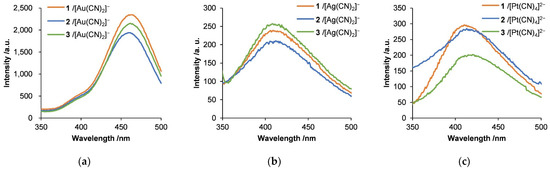 Emission spectra of hybrids of (a) [Au(CN)2]−, (b) [Ag(CN)2]−, and (c) [Pt(CN)4]2− with diblock copolypeptide amphiphiles 1–3, where [Au(CN)2]− = 3.5 mM, [Ag(CN)2]− = 5.0 mM, and [Pt(CN)4]2− = 2.7 mM. Excitation wavelength = 335 nm.