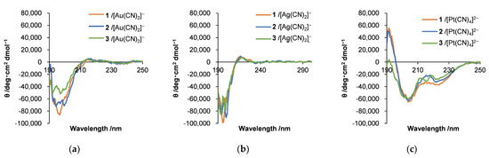 Circular dichroism spectra obtained from hybrids of (a) [Au(CN)2]−, (b) [Ag(CN)2]−, and (c) [Pt(CN)4]2− with diblock copolypeptide amphiphiles 1–3, where [Au(CN)2]− = 3.5 mM, [Ag(CN)2]− = 5.0 mM, and [Pt(CN)4]2− = 2.7 mM.