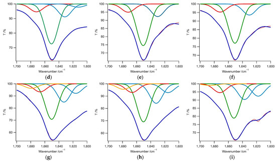 FTIR spectra (purple curves) in the amide I region obtained from the (a–c) 1–3/[Au(CN)2]−, (d–f) 1–3/[Ag(CN)2]−, and (g–i) 1–3/[Pt(CN)4]2− hybrids, where [Au(CN)2]− = 3.5 mM, [Ag(CN)2]− = 5.0 mM, and [Pt(CN)4]2− = 2.7 mM. Multiple Gaussian fitting was used to determine the secondary structural components. Blue, green, red, and orange curves denote the amide I features related to β-sheet (1610–1640 cm−1), random coil (1640–1660 cm−1, including PII structures), 310-helix or β-turn-like (1660–1685 cm−1), and antiparallel β-sheet structures (1675–1690 cm−1), respectively [72,73,74,75,76]. The overall curve fittings are indicated by the red lines.