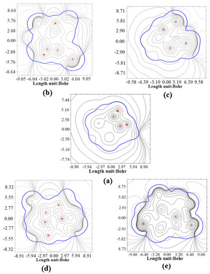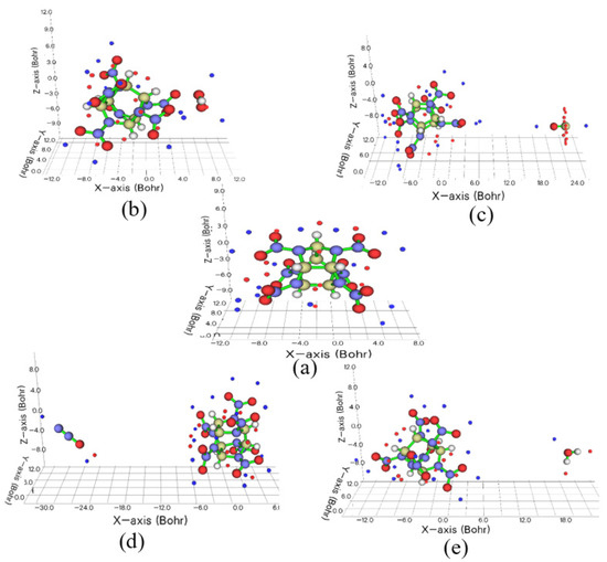The electric charge density of CL-20 and its complexes: (a) CL-20, (b) CL-20/H2O2, (c) CL-20/CO2, (d) CL-20/N2O, and (e) CL-20/H2O, respectively.