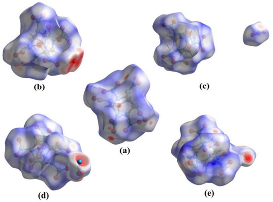 Hirshfeld surfaces of the CL-20 molecule and its four host–guest complexes showing intermolecular contacts: (a) CL-20, (b) CL-20/H2O2, (c) CL-20/CO2, (d) CL-20/N2O, and (e) CL-20/H2O.