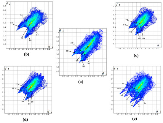 Two-dimensional fingerprint plots of close interatomic contacts of CL-20 molecules in pure form and in four host–guest complexes: (a) CL-20, (b) CL-20/H2O2, (c) CL-20/CO2, (d) CL-20/N2O, and (e) CL-20/H2O.