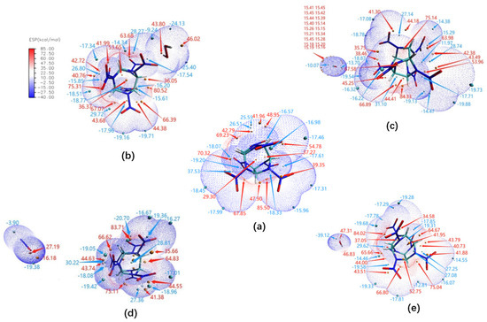 ESP—mapped molecular vdW surface of: (a) CL-20, (b) CL-20/H2O2, (c) CL-20/CO2, (d) CL-20/N2O, and (e) CL-20/H2O. The unit is in kcal·mol−1. Surface local minima and maxima of ESP are represented as green and orange spheres, respectively. The global minimum and maximum are labeled by blue and red colors, respectively.