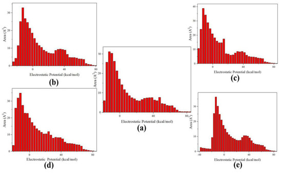 Surface area in each ESP range on the vdW surface of: (a) CL-20, (b) CL-20/H2O2, (c) CL-20/CO2, (d) CL-20/N2O, and (e) CL-20/H2O.