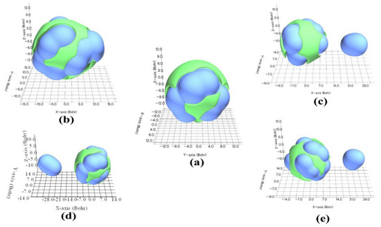 An amount of 0.5 kcal/mol isosurface of vdW potential of CL-20 and its complexes: (a) CL-20, (b) CL-20/H2O2, (c) CL-20/CO2, (d) CL-20/N2O, and (e) CL-20/H2O, respectively. Green and blue surfaces correspond to negative and positive parts, respectively.