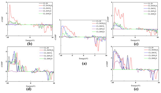 The -COHP curves for the CL-20 interactions of CL-20 and its complexes: (a) C-H bonds, (b) C-C bonds, (c) C-N bonds, (d) N-N bonds, and (e) N-O bonds, respectively. In the -COHP curves, the positive and negative signs represent bonding and antibonding states, respectively. The thick trendline corresponds to the actual concentration data of the corresponding matching color.