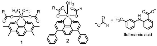 Chemical structures of nickel(II)-flufenamic acid complexes with 3,4,7,8-tetramethyl-1,10-phenanthroline or 4,7-diphenyl-1,10-phenanthroline (1 and 2) prepared and investigated in this study.