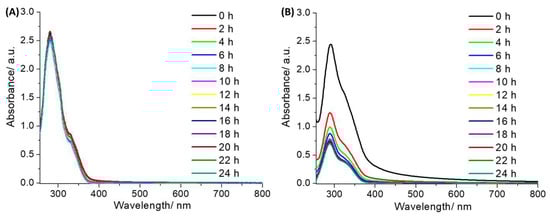 UV-Vis spectra of (A) 1 and (B) 2 (both 50 μM) in Dulbecco’s Modified Eagle Medium (DMEM):DMSO (200:1) over the course of 24 h at 37 °C.
